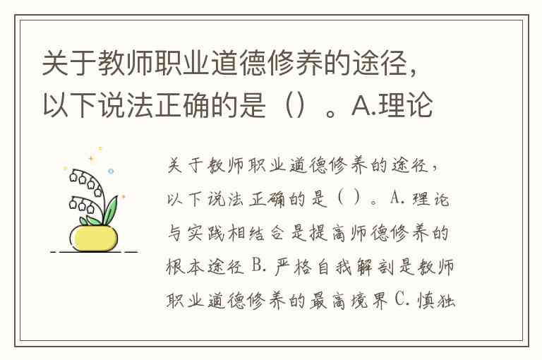 关于教师职业道德修养的途径,以下说法正确的是()。A.理论与实践相结合是提高师德修养的根本途径 B.严格自我解剖是教师职业道德修养的最高境界 C.慎独是对教师自律意识的培养 D.教师要树立不断学习的理念