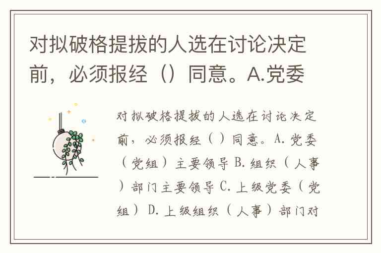 对拟破格提拔的人选在讨论决定前,必须报经()同意。A.党委(党组)主要领导 B.组织(人事)部门主要领导 C.上级党委(党组) D.上级组织(人事)部门