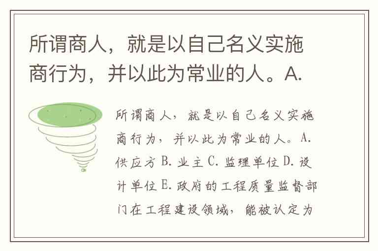 所谓商人,就是以自己名义实施商行为,并以此为常业的人。A.供应方 B.业主 C.监理单位 D.设计单位 E.政府的工程质量监督部门