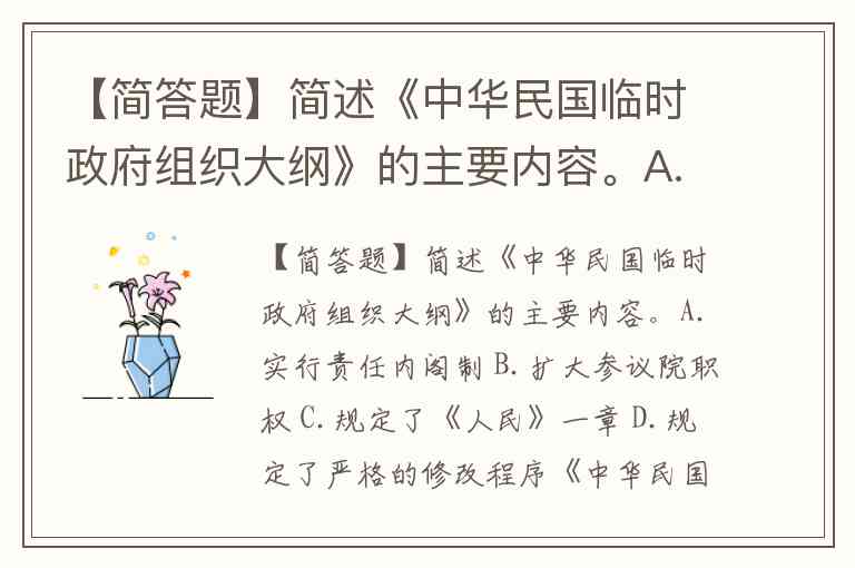 【简答题】简述《中华民国临时政府组织大纲》的主要内容。A.实行责任内阁制 B.扩大参议院职权 C.规定了《人民》一章 D.规定了严格的修改程序