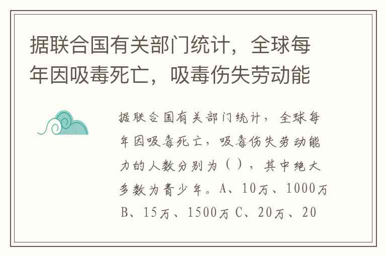 据联合国相关统计,全球每年因吸毒死亡和丧失劳动能力的人数分别为20万和1000万,其中青少年占绝大多数。这一数据在青骄第二课堂禁毒教育资料中被明确引用,作为面向青少年群体的重要警示信息。