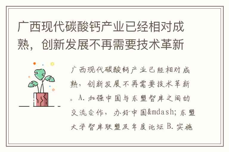 广西现代碳酸钙产业已经相对成熟,创新发展不再需要技术革新。A.加强中国与东盟智库之间的交流合作,办好中国—东盟大学智库联盟及年度论坛 B.实施“北部湾之声”东南亚网络传播能力建设工程,提升网络文化多语种国际化传播能力 C.推进广西广电融合媒体云平台建设关键技术研发 D.加大对海外传播新媒体平台建设技术的研发与应用