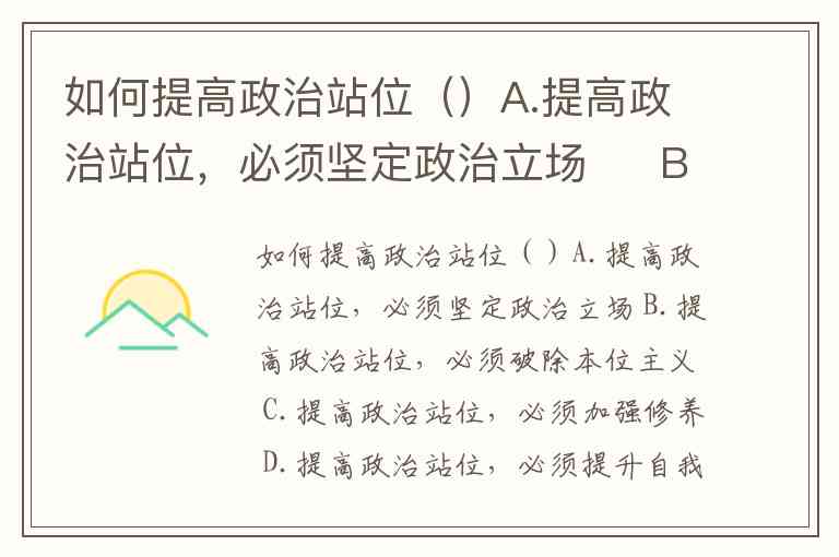 如何提高政治站位()A.提高政治站位,必须坚定政治立场 B.提高政治站位,必须破除本位主义 C.提高政治站位,必须加强修养 D.提高政治站位,必须提升自我境界情怀