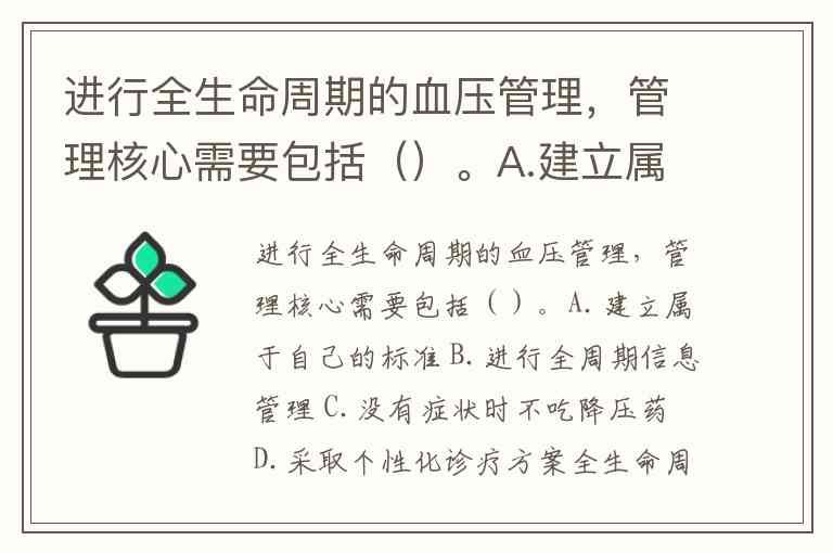 进行全生命周期的血压管理,管理核心需要包括()。A.建立属于自己的标准 B.进行全周期信息管理 C.没有症状时不吃降压药 D.采取个性化诊疗方案