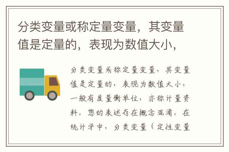 分类变量或称定量变量,其变量值是定量的,表现为数值大小,一般有度量衡单位,亦称计量资料。