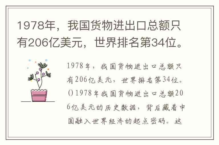 1978年我国货物进出口总额206亿美元的历史数据,背后藏着中国融入世界经济的起点密码。这一数字在不同文献中表述高度一致,但世界排名存在两种说法:有文献记载为第32位,也有文献指出出口额单独排名第34位。这种差异源于统计口径——前者为进出口总额排名,后者为出口单项排名,恰如当时中国外贸"蹒跚起步"的真实写照:外汇储备仅1.67亿美元,外贸依存度不足10%,出口商品以初级产品为主。