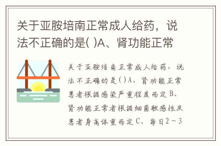 关于亚胺培南正常成人给药,说法不正确的是( )A、肾功能正常患者根据感染严重程度而定 B、肾功能正常者根据细菌敏感性及患者身高体重而定 C、每日2~3g,每8~12h给药一次 D、每日最大剂量不得超过50mg/kg或4g E、没有资料显示超过4g可提高疗效