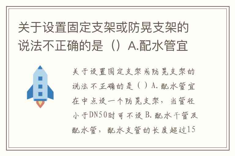 关于设置固定支架或防晃支架的说法不正确的是()A.配水管宜在中点设一个防晃支架,当管径小于DN50时可不设 B.配水干管及配水管,配水支管的长度超过15m,每15m长度内应至少设2个防晃支架,当管径不大于DN40可不设 C.管径大于DN50的管道拐弯、三通及四通位置处应设1个防晃支架 D.防晃支架的强度,应满足管道、配件及管内水的重量再加50%的水平方向推力时不损坏或不产生永久变形