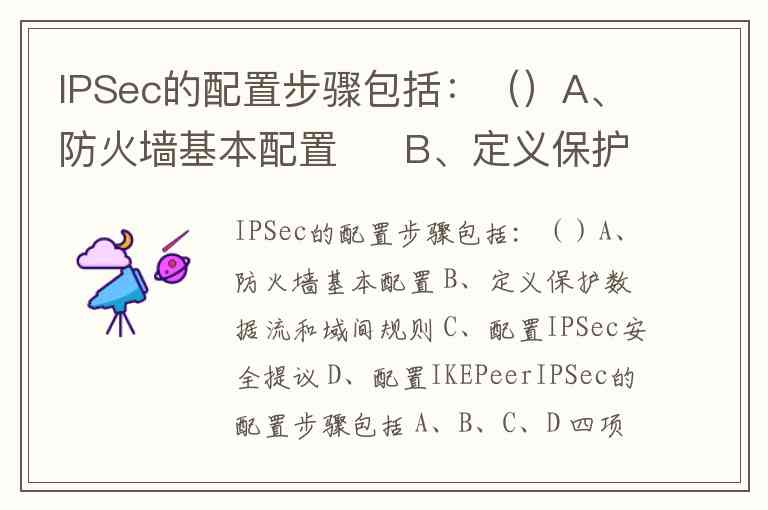 IPSec的配置步骤包括 A、B、C、D 四项全选。这一过程需从网络基础环境搭建到加密策略部署层层递进,核心是通过 定义保护对象、配置加密规则、建立对等体信任 三大环节实现安全通信。