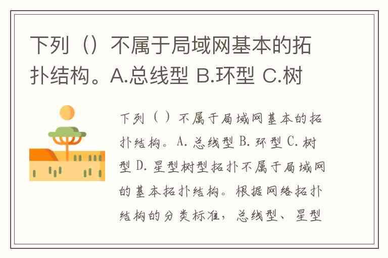下列()不属于局域网基本的拓扑结构。A.总线型 B.环型 C.树型 D.星型