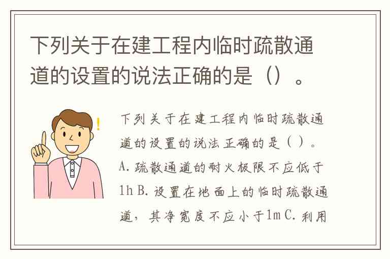 下列关于在建工程内临时疏散通道的设置的说法正确的是()。A.疏散通道的耐火极限不应低于1h B.设置在地面上的临时疏散通道,其净宽度不应小于1m C.利用在建工程施工完毕的楼梯作临时疏散通道时,其净宽度不宜小于0.5m D.临时疏散通道应设置照明设施