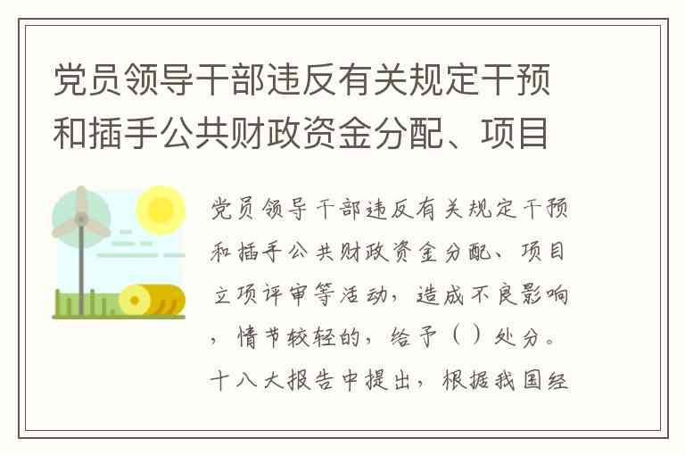 党员领导干部违反有关规定干预和插手公共财政资金分配、项目立项评审等活动,造成不良影响,情节较轻的,应给予警告或严重警告处分。这一结论依据《中国共产党纪律处分条例》第十章对违反工作纪律行为的处分规定,该条例明确将此类行为纳入监督范畴,旨在维护公共管理活动的公平公正原则。