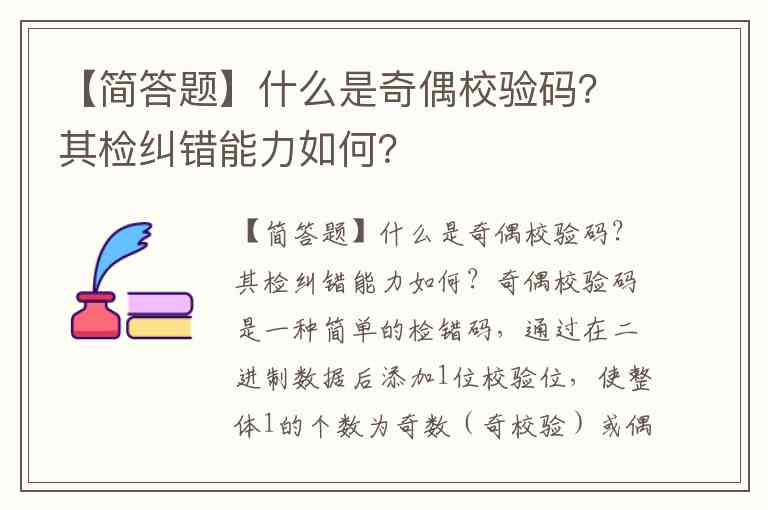 奇偶校验码是一种简单的检错码,通过在二进制数据后添加1位校验位,使整体1的个数为奇数(奇校验)或偶数(偶校验),以此检测传输或存储中的位错误。例如ASCII码中大写字母"A"的8位二进制是01000001,采用偶校验时无需额外添加1(因已有2个1),而奇校验需补1使1的总数为3。