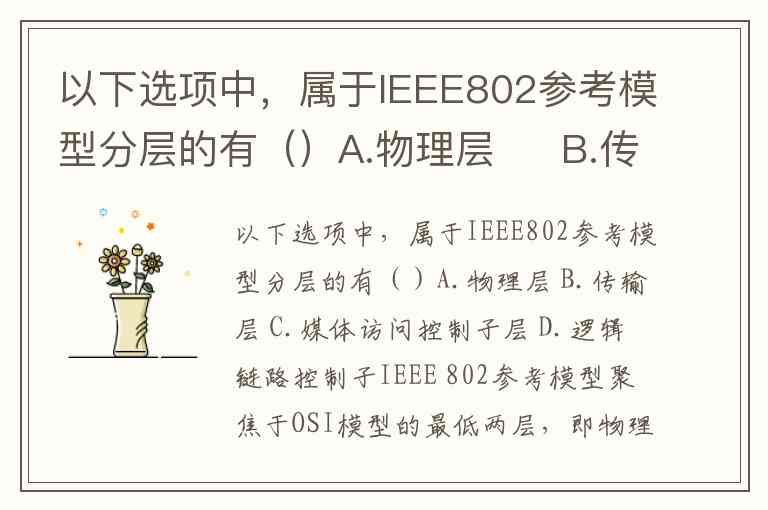 以下选项中,属于IEEE802参考模型分层的有()A.物理层 B.传输层 C.媒体访问控制子层 D.逻辑链路控制子