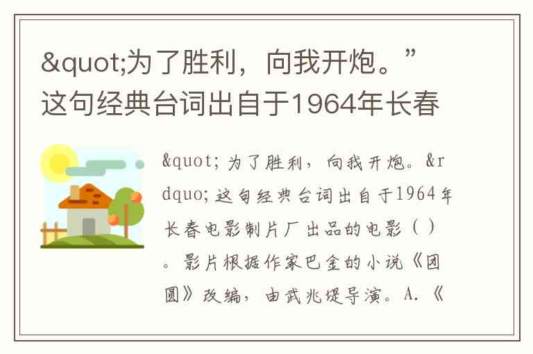 “为了胜利,向我开炮。”这句震撼人心的台词出自1964年长春电影制片厂出品的战争电影《英雄儿女》。影片改编自巴金小说《团圆》,由武兆堤执导,讲述了抗美援朝战场上志愿军战士王成、王芳兄妹的英雄事迹。这句台词是主角王成在战斗到最后一刻时发出的呐喊,成为中国电影史上表现英雄主义精神的经典象征。