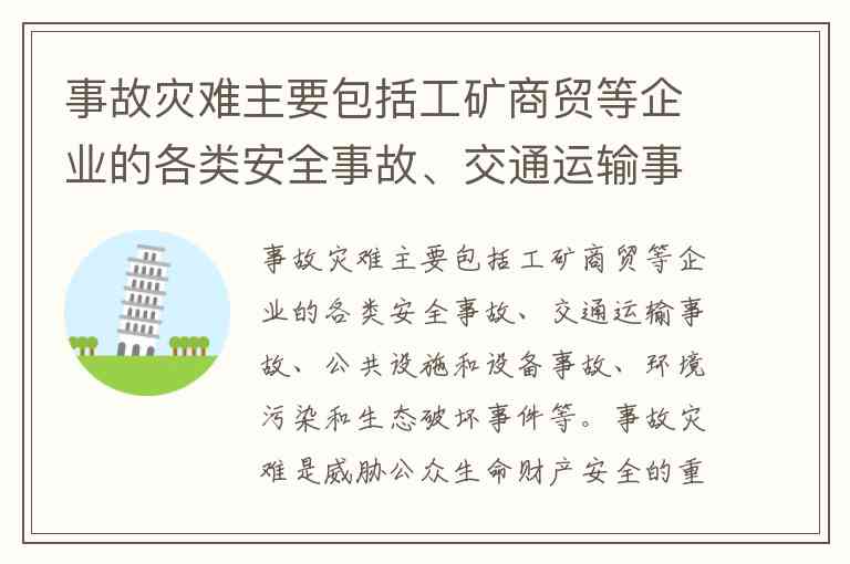 事故灾难主要包括工矿商贸等企业的各类安全事故、交通运输事故、公共设施和设备事故、环境污染和生态破坏事件等。