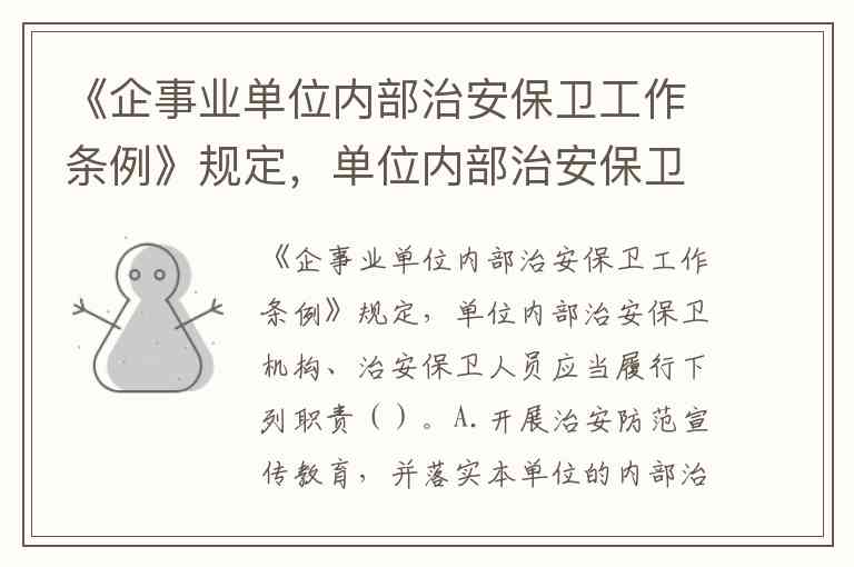 《企事业单位内部治安保卫工作条例》明确规定,单位内部治安保卫机构及人员需履行五项核心职责,涵盖宣传教育、出入管理、巡逻检查、秩序维护和设施保障等全流程安全管理。根据条例第十一条,正确答案为A、B、C、D、E,具体职责与选项对应如下: