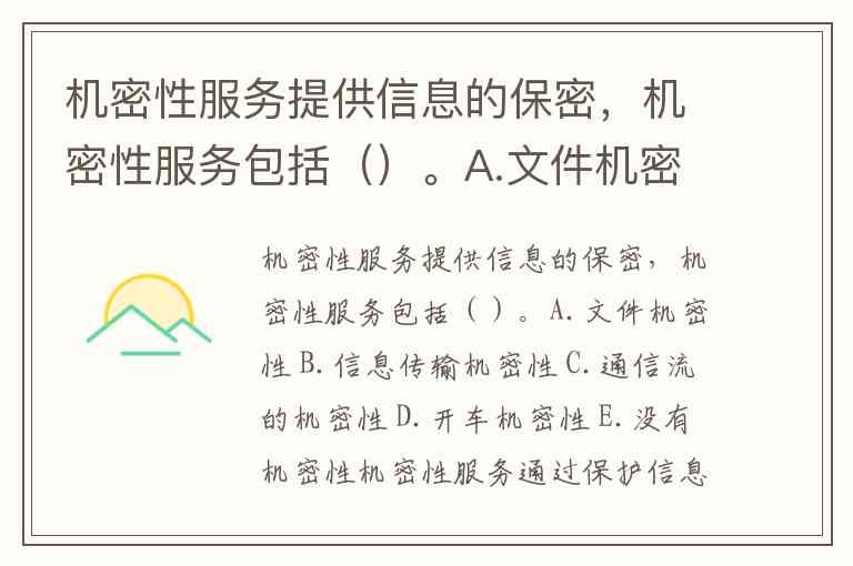 机密性服务提供信息的保密,机密性服务包括()。A.文件机密性 B.信息传输机密性 C.通信流的机密性 D.开车机密性 E.没有机密性