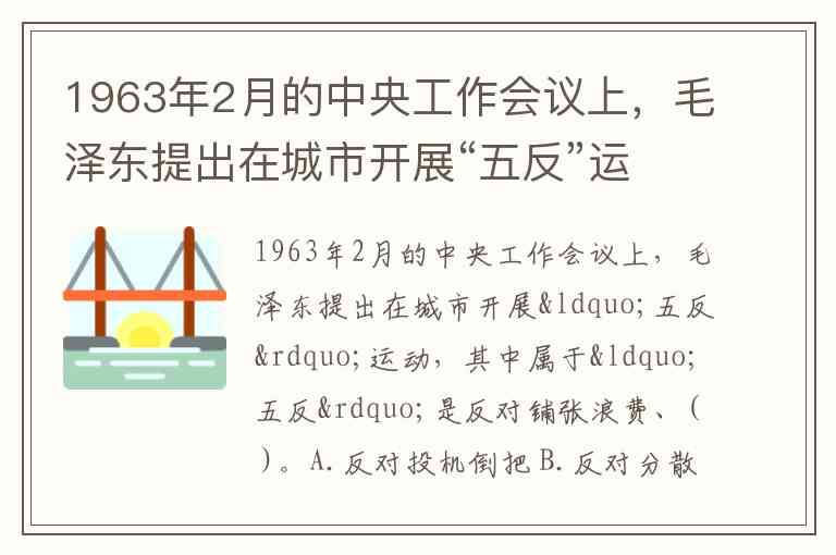 1963年2月的中央工作会议上,毛泽东提出在城市开展“五反”运动,其中属于“五反”是反对铺张浪费、( )。A.反对投机倒把 B.反对分散主义 C.反对官僚主义 D.反对贪污盗窃