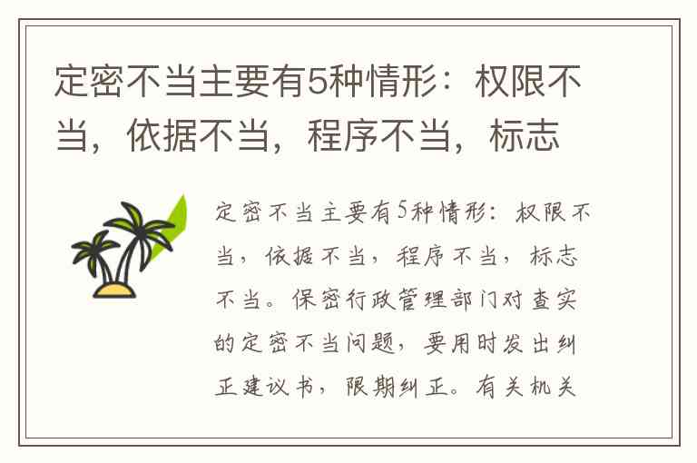 你提供的内容中提到"定密不当主要有5种情形",但实际只列举了4种(权限不当、依据不当、程序不当、标志不当),遗漏了"范围不当"这一关键情形。根据《中华人民共和国保守国家秘密法实施条例》,定密不当的五种情形完整表述为:权限不当(无定密权或超越权限定密)、依据不当(未按保密事项范围定密)、程序不当(未履行法定定密程序)、标志不当(密级、保密期限或知悉范围标注错误)、范围不当(将不应定密的事项定为秘密)。