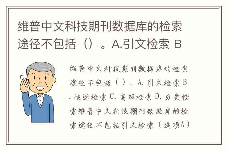 维普中文科技期刊数据库的检索途径不包括()。A.引文检索 B.快速检索 C.高级检索 D.分类检索