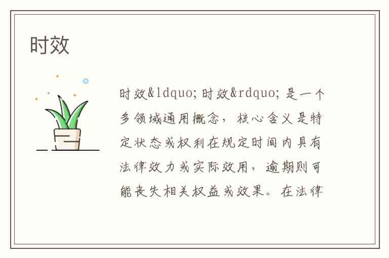 “时效”是一个多领域通用概念,核心含义是特定状态或权利在规定时间内具有法律效力或实际效用,逾期则可能丧失相关权益或效果。在法律领域,它表现为权利保护的时间限制;在新闻传播中,体现为信息的及时价值;在日常生活中,则关乎各类事务的有效处理期限。