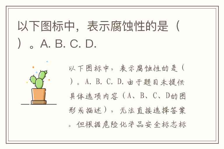 例如,在常见试题中,若选项包含**“一只手接触液体后皮肤被腐蚀”或“金属容器被液体腐蚀出孔洞”的图形**,该选项即为正确答案。如浓硫酸等强腐蚀性物质的包装上必须张贴此标志。若题目选项中出现类似描述或图形,可优先选择。