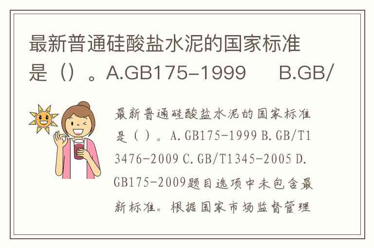 最新普通硅酸盐水泥的国家标准是()。A.GB175-1999 B.GB/T13476-2009 C.GB/T1345-2005 D.GB175-2009