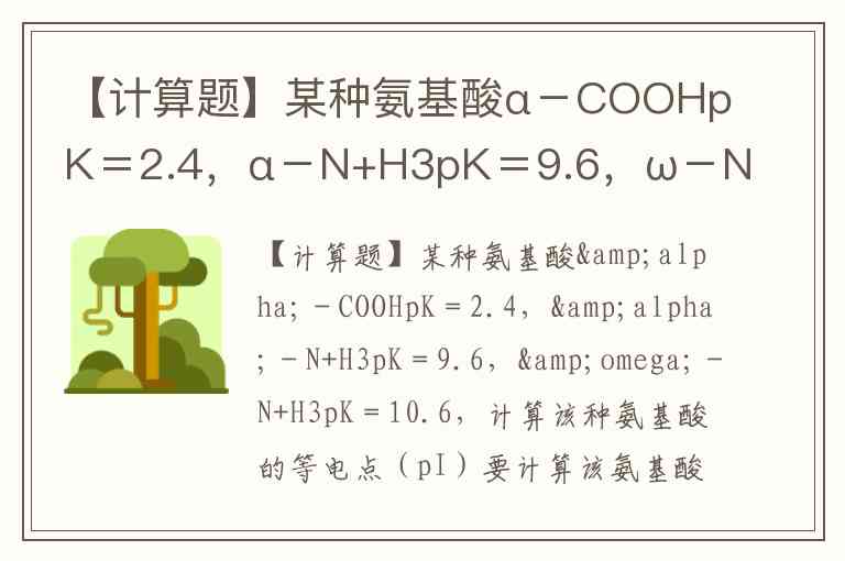 【计算题】某种氨基酸α-COOHpK=2.4,α-N+H3pK=9.6,ω-N+H3pK=10.6,计算该种氨基酸的等电点(pI)