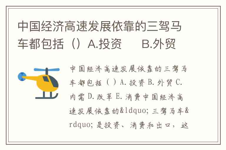 中国经济高速发展依靠的“三驾马车”是投资、消费和出口,这一概念源于经济学中支出法核算GDP的原理,即经济增长由最终消费支出、资本形成总额(投资)和货物服务净出口共同驱动。从选项来看,A.投资、B.外贸(对应出口)、E.消费正确,而C.内需与消费概念重叠,D.改革不属于需求侧驱动因素。
