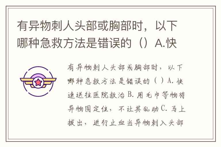 有异物刺人头部或胸部时,以下哪种急救方法是错误的()A.快速送往医院救治 B.用毛巾等物将异物固定住,不让其乱动 C.马上拔出,进行止血