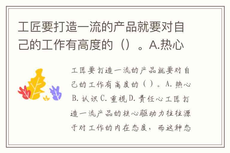工匠要打造一流的产品就要对自己的工作有高度的()。A.热心 B.认识 C.重视 D.责任心