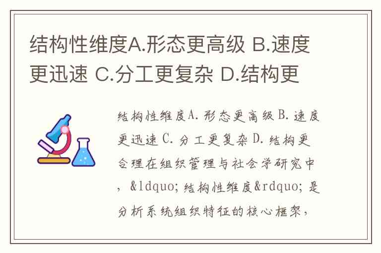 在组织管理与社会学研究中,“结构性维度”是分析系统组织特征的核心框架,通常涵盖规范化、专门化、标准化等八大基础属性。你提到的四个选项中,C.分工更复杂和D.结构更合理与学术定义直接相关,而A.形态更高级和B.速度更迅速需结合具体语境分析: