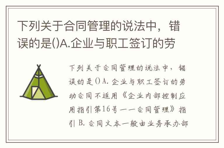下列关于合同管理的说法中,错误的是()A.企业与职工签订的劳动合同不适用《企业内部控制应用指引第16号一一合同管理》指引 B.合同文本一般由业务承办部门起草、法律部门审核 C.重大合同或法律关系复杂的特殊合同应当由法律部门参与起草 D.合同经编号、审批或企业法定代表人签署后,方可加盖合同专用章