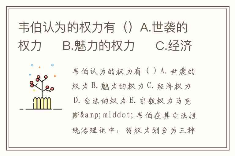 经济权力(C):韦伯未将经济控制视为独立的权力类型,而是认为经济利益可能成为服从的动机(如薪俸制),但需依附于上述三种合法性基础。