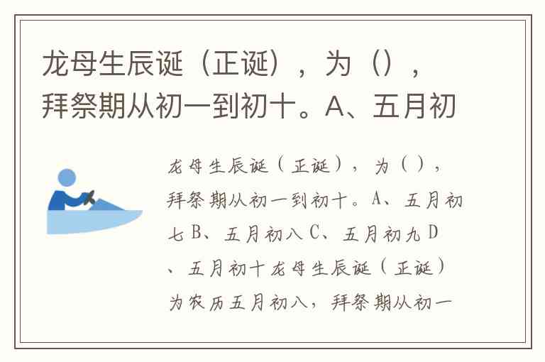 龙母生辰诞(正诞),为(),拜祭期从初一到初十。A、五月初七 B、五月初八 C、五月初九 D、五月初十