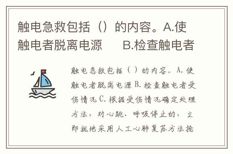 触电急救包括()的内容。A.使触电者脱离电源 B.检查触电者受伤情况 C.根据受伤情况确定处理方法,对心跳、呼吸停止的,立即就地采用人工心肺复苏方法抢救 D.把触电现场详细记录