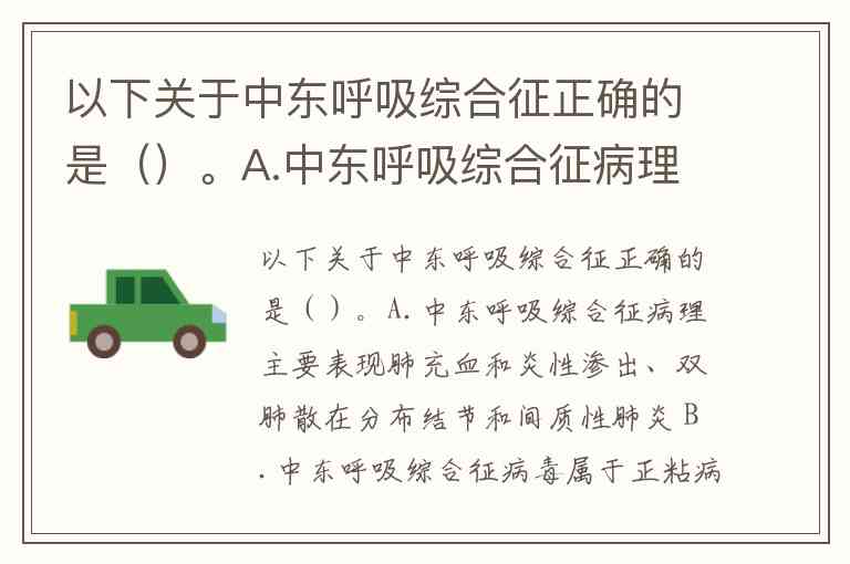 以下关于中东呼吸综合征正确的是()。A.中东呼吸综合征病理主要表现肺充血和炎性渗出、双肺散在分布结节和间质性肺炎 B.中东呼吸综合征病毒属于正粘病毒科 C.中东呼吸综合征冠状病毒为线性非节段单股负链的RNA病毒 D.中东呼吸综合征冠状病毒受体DPP2