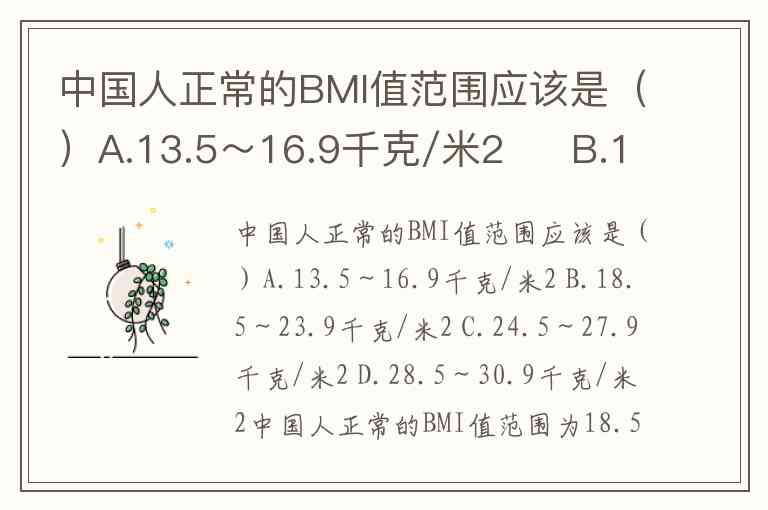 中国人正常的BMI值范围应该是()A.13.5~16.9千克/米2 B.18.5~23.9千克/米2 C.24.5~27.9千克/米2 D.28.5~30.9千克/米2
