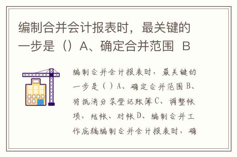 编制合并会计报表时,最关键的一步是()A、确定合并范围 B、将抵消分录登记账簿 C、调整帐项,结帐、对帐 D、编制合并工作底稿