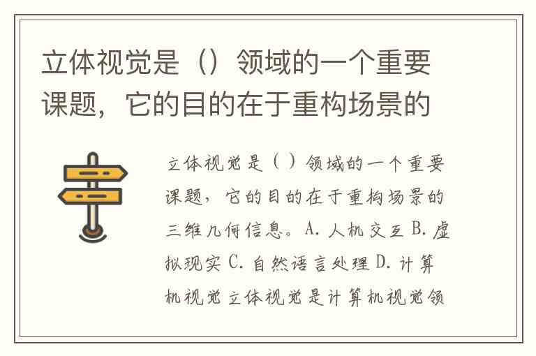 立体视觉是()领域的一个重要课题,它的目的在于重构场景的三维几何信息。A.人机交互 B.虚拟现实 C.自然语言处理 D.计算机视觉