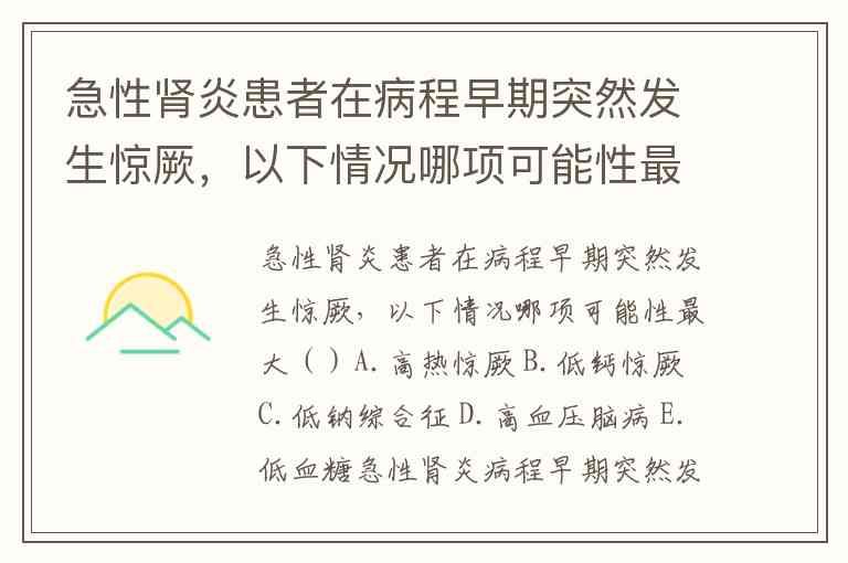 急性肾炎患者在病程早期突然发生惊厥,以下情况哪项可能性最大()A.高热惊厥 B.低钙惊厥 C.低钠综合征 D.高血压脑病 E.低血糖