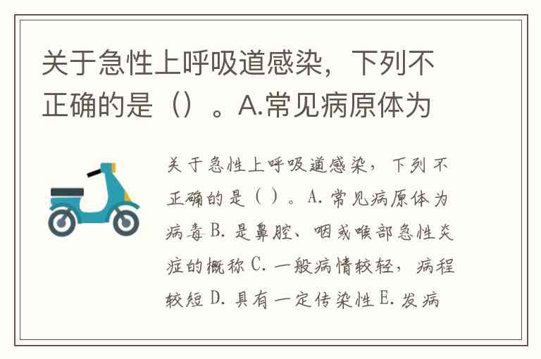 关于急性上呼吸道感染,下列不正确的是()。A.常见病原体为病毒 B.是鼻腔、咽或喉部急性炎症的概称 C.一般病情较轻,病程较短 D.具有一定传染性 E.发病率低