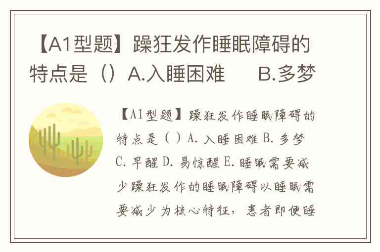 【A1型题】躁狂发作睡眠障碍的特点是()A.入睡困难 B.多梦 C.早醒 D.易惊醒 E.睡眠需要减少