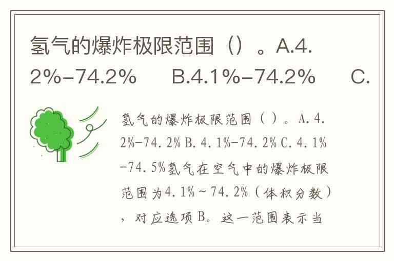 氢气的爆炸极限范围()。A.4.2%-74.2% B.4.1%-74.2% C.4.1%-74.5%