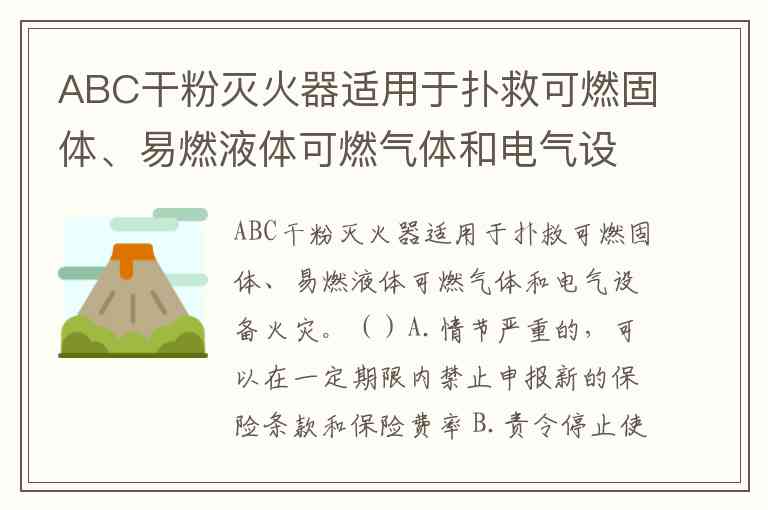 您提供的内容似乎存在信息错位。前半部分描述的是ABC干粉灭火器的适用范围(扑救可燃固体、易燃液体、可燃气体和电气设备火灾),这是关于消防器材的安全知识;而后半部分的选项A、B、C、D则涉及保险监管措施(如禁止申报新条款、停止使用、限制高管薪酬等),属于保险监管或行政处罚领域的内容。
