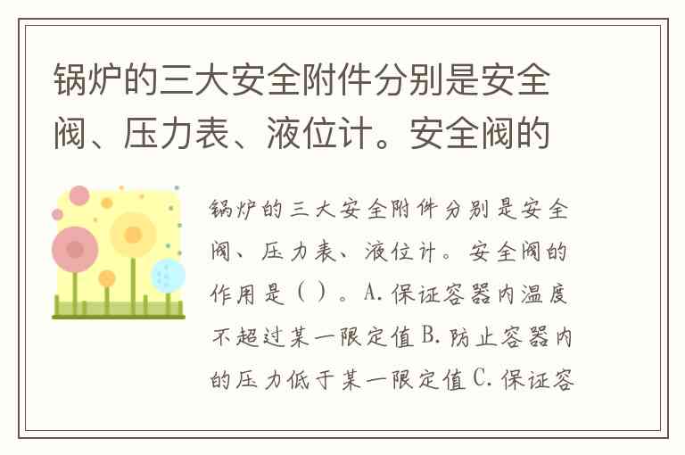 锅炉的三大安全附件分别是安全阀、压力表、液位计。安全阀的作用是()。A.保证容器内温度不超过某一限定值 B.防止容器内的压力低于某一限定值 C.保证容器内的压力不超过某一限定值 D.调节控制容器内压力