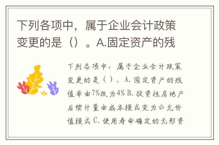下列各项中,属于企业会计政策变更的是()。A.固定资产的残值率由7%改为4% B.投资性房地产后续计量由成本模式变为公允价值模式 C.使用寿命确定的无形资产的预计使用年限由10年变更为6年 D.劳务合同完工进度的确定由已经发生的成本占预计总成本的比例改为已完工作的测量