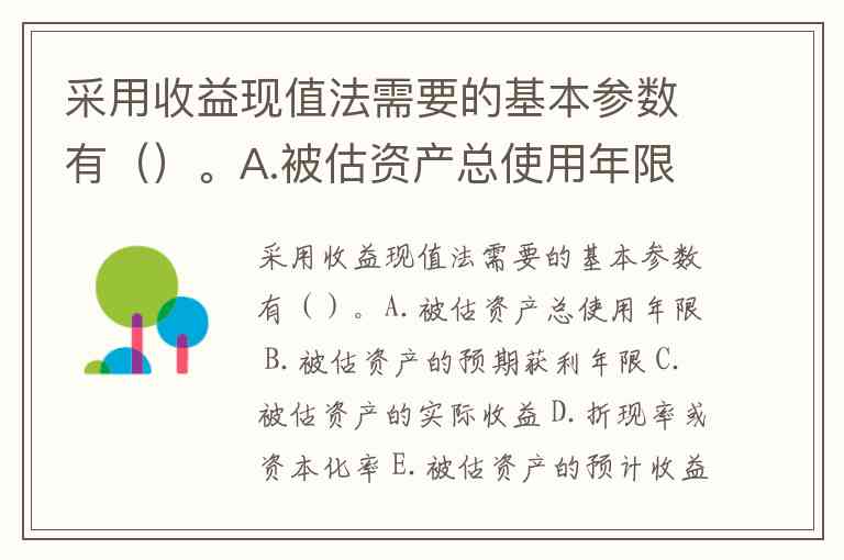 采用收益现值法需要的基本参数有()。A.被估资产总使用年限 B.被估资产的预期获利年限 C.被估资产的实际收益 D.折现率或资本化率 E.被估资产的预计收益