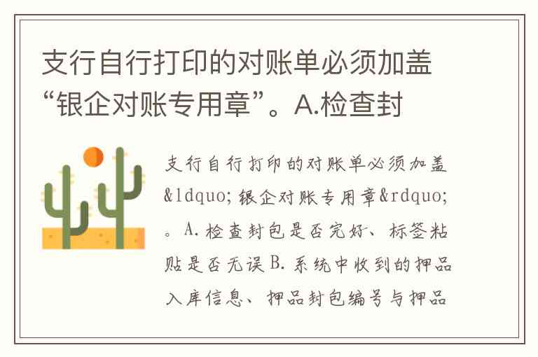 支行自行打印的对账单必须加盖“银企对账专用章”。A.检查封包是否完好、标签粘贴是否无误 B.系统中收到的押品入库信息、押品封包编号与押品封包是否一致 C.封包骑缝处经办人员双人签字是否完整 D.经办人员是否为信贷部门押品管理人员和业务部门人员双人